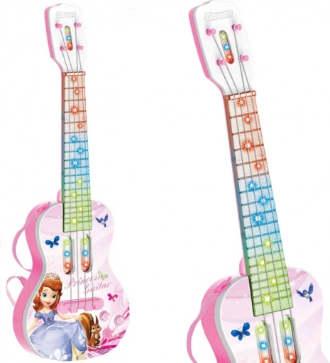 Elektrisk guitar til børn i en livlig pink farve, ideel til at introducere de mindste til musikkens verden. Guitaren tiltrækker opmærksomhed ikke kun med sit design, men også med farverige lyseffekter, som giver enhver optræden en særlig charme. Disse lyseffekter er en fantastisk måde at skabe en ægte koncertstemning i hjemmet. Guitaren er udsmykket med et prinsessemotiv fra et populært eventyr for børn.