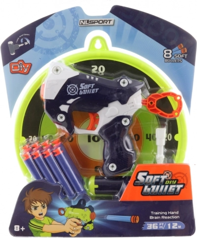 I pakken finder du pistol, målskive, 8 skumskud og en skruetrækker – alt, hvad du behøver for øjeblikkelig sjov.