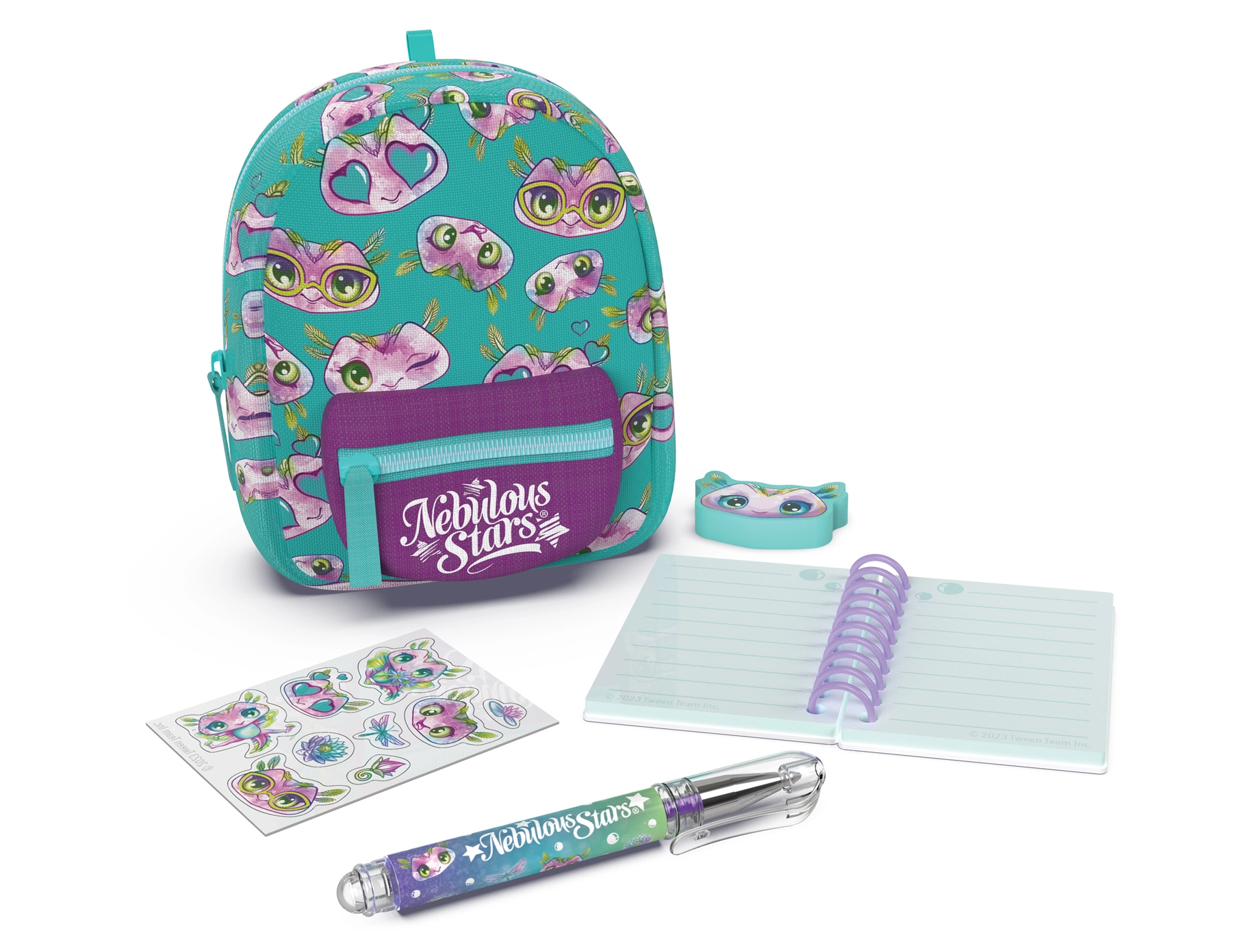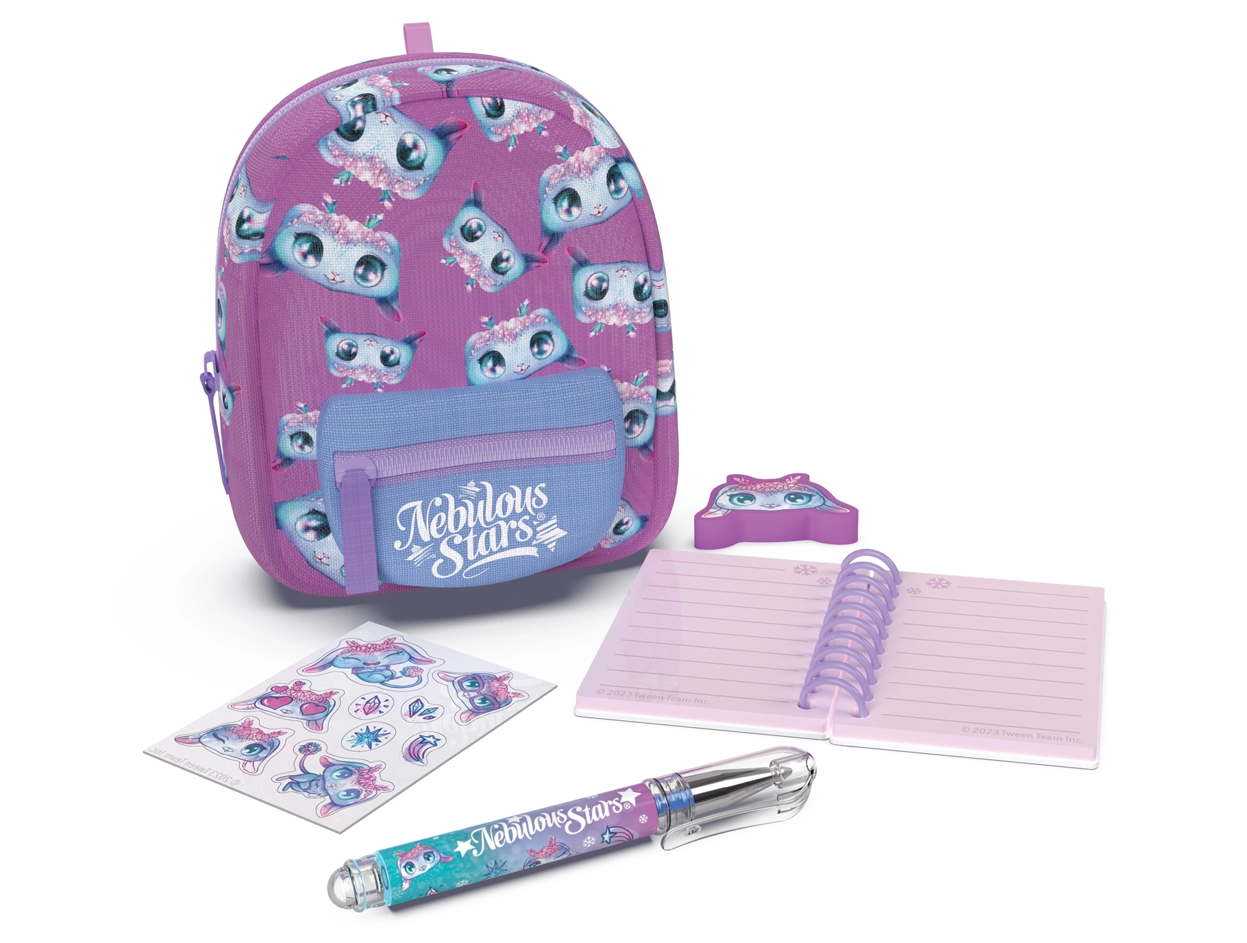 Stilfuld mini-rygsæk NEBULOUS STARS med et sæt papirvarer er ideel til små kreative sjæle og på farten. I det kompakte mål 9 × 6 × 11 cm gemmer den alt nødvendigt: linjeret notesbog, kuglepen, viskelæder, klistermærker og en sød vedhæng. Fås i 3 farvevarianter – blå, hvid og lilla.