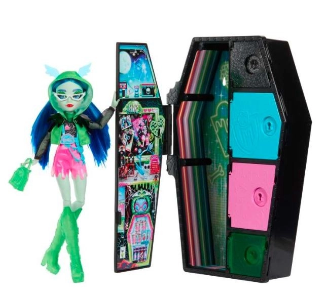 Oplev Neon Frights-udgaven – MONSTER HIGH-dukken med over 19 overraskelser og Color Reveal-effekt. Tre accessories lyser i mørke, den fuldt bevægelige dukke giver styling i over 125 outfits, og alt kan opbevares i et kisteformet skab til leg og nem transport.