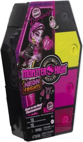 Oplev elektriserende sjov med Monster High Skulltimate Secrets i Neon-udgaven, som bringer mere end 19 overraskelser, et kisteskab og tre accessories, der lyser i mørke. Takket være Color Reveal-effekter, fuldt ledet krop og masser af tilbehør er det det perfekte valg til kreativ leg og samleri.