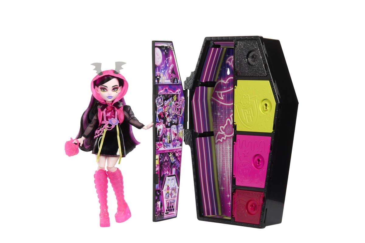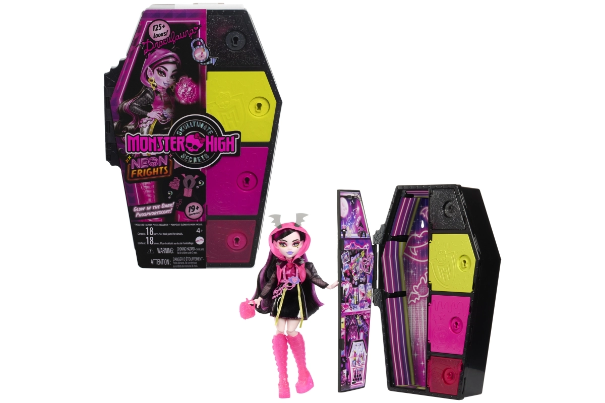 Neon-udgaven bringer de populære Skulltimate Secrets tilbage i et endnu mere strålende design. Inde i det stilfulde kisteskab venter en dukke med masser af tilbehør, farveskiftende effekter og accessories, der lyser i mørke. Legen får en ny dimension af stemning og fantasi.