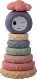 Byg et farverigt tårn med et sødt kattehoved og en blomsterformet hat. Seks pastelfarvede ringe med forskellige overflader indbyder til at udforske, klemme og sætte på. Nogle dele piber ved tryk, hvilket stimulerer hørelsen og lærer årsag–virkning.