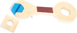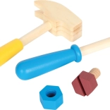 Træhammer, skruetrækker, nøgle og tang er designet til små børnehænder. De støtter naturlig fingerfærdighed og efterligning af rigtigt arbejde.