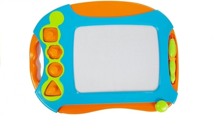 Sættet inkluderer en stor tavle med praktisk håndtag, en magnetisk stylus og fire stempler i geometriske former. Det holdbare plastdesign, de behagelige farver og gennemtænkte detaljer gør den til det ideelle legetøj derhjemme, i børnehaven og på rejser.