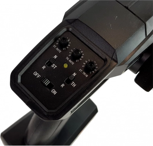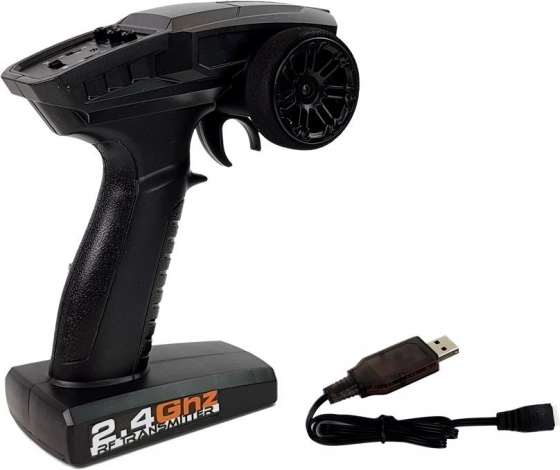 Den ergonomiske sender muliggør fin dosering af gas og præcis styring. 2,4 GHz-frekvensen eliminerer interferens, og en rækkevidde på op til 80 m giver frihed under kørslen. Strømforsyning 3× AA (medfølger ikke).
