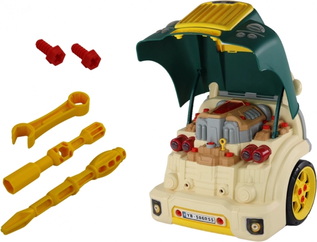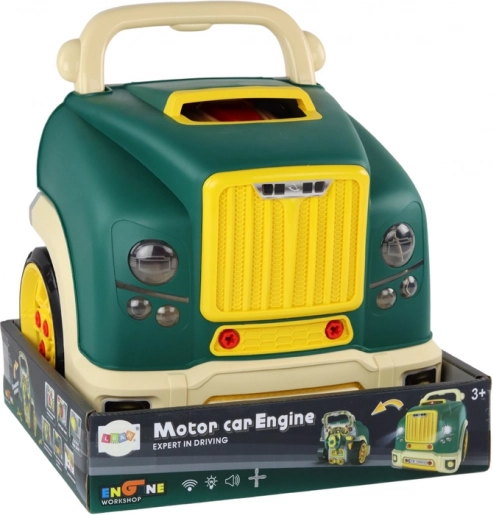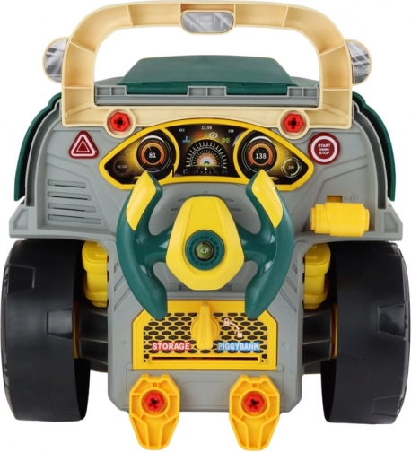 Dette børnemontageværksted i form af en grøn lastbil kombinerer leg og læring i ét. Børn kan skrue hjulene af, åbne motorhjelmen og udforske motoren, mens de træner hånd-øje-koordination og tålmodighed. Det interaktive instrumentbræt med rat, horn, start/stop-knap, advarselsknap og “gearskifter” giver realistiske køreoplevelser.