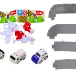 Tre politibiler, trafikskilte, kegler og “vej”-dele udvider lege-mulighederne og understøtter udviklingen af fantasi og finmotorik.