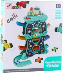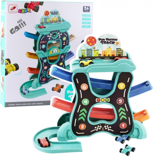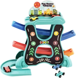 Denne farverige racerbane med minibiler er den ideelle legetøj til at udvikle motorik og fantasi. Børn ser bilerne suse ned ad tre niveauer af nedkørsler og træner samtidig farveopfattelse, årsag og virkning samt tålmodighed. Den robuste konstruktion egner sig til daglig leg.