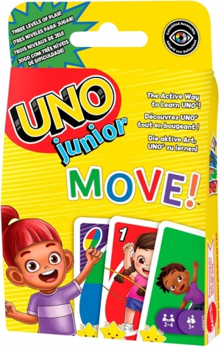 Oplev UNO Junior Move – en sprudlende børnevariant af det legendariske kortspil. Målet er klart: kom af med alle kortene. Men pas på, særlige kort med instruktioner tilføjer bevægelse og sjov: hop på stedet, lav et par squats eller klap tre gange. Hver runde er derfor aktiv, sjov og uforudsigelig.