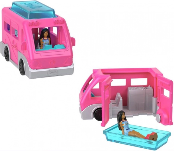 Oplev den ikoniske rejsestil i mini-format. Den lille BARBIE DreamCamper imponerer med et detaljeret interiør med køkken, åbnbare døre og smart opbevaring. Det aftagelige bassin kan sættes på taget og har en temperaturaktiveret farveskiftende effekt – koldt vand ændrer farven, varmt vand skifter den tilbage.