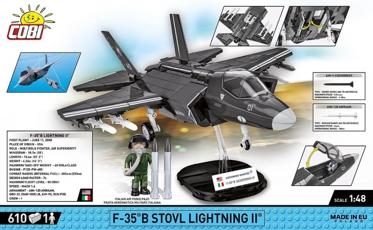 Byggesættet er ideelt til luftfartsentusiaster, militærteknikinteresserede og fans af byggesæt. Byggeprocessen er enkel selv for mindre erfarne byggere takket være den intuitive vejledning. F-35B-modellen vil begejstre alle uanset alder!