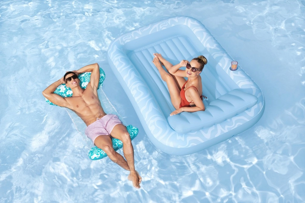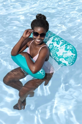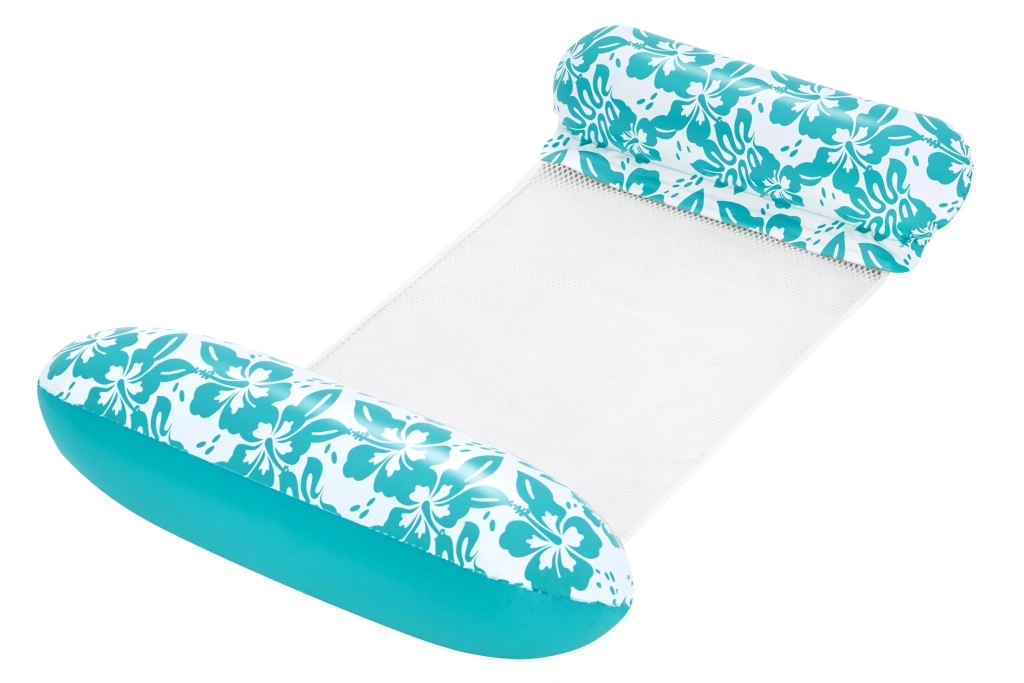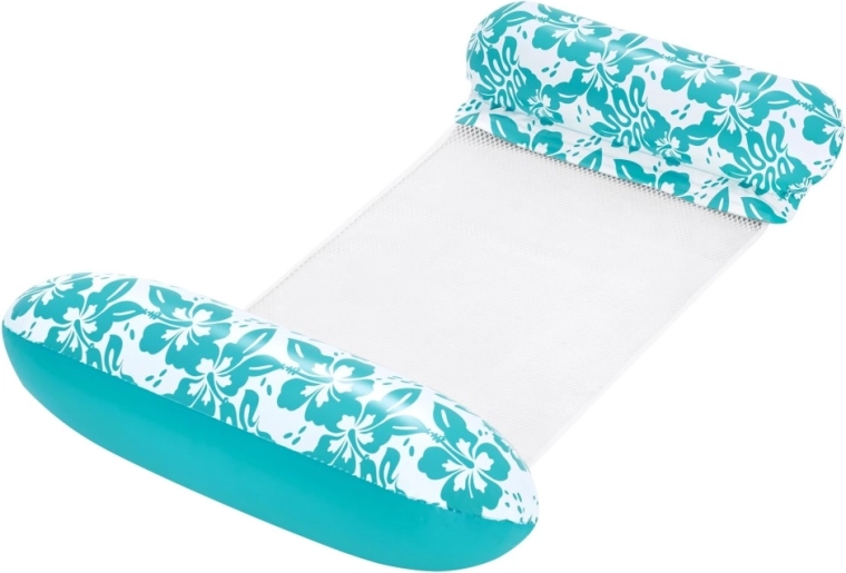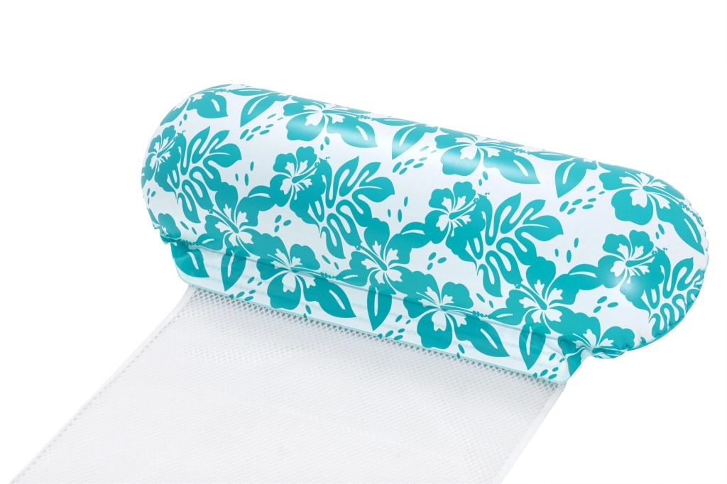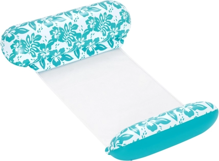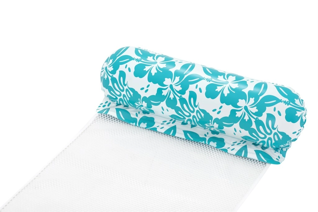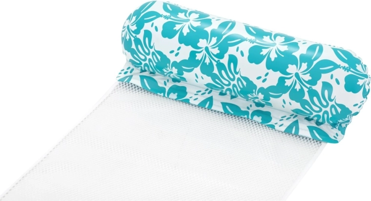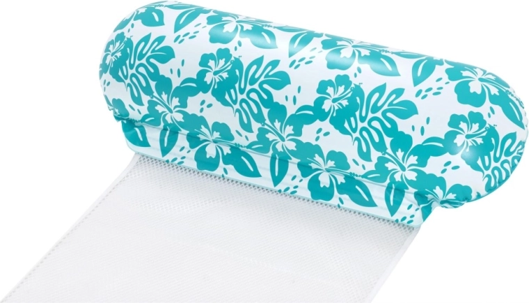 Den multifunktionelle oppustelige vandhængekøje kombinerer praktisk design og et attraktivt look med turkis-hvidt blomstermønster. CoolDown2122-nettet løfter dig blidt og lader kroppen være behageligt nedsænket for effektiv afkøling. De oppustelige hoved- og benstøtter af blød, holdbar vinyl sikrer komfortable positioner under både svømning og afslapning.