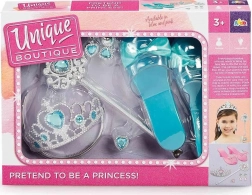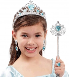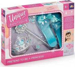 Sættet til små prinsesser blå er perfekt til alle unge prinsesser, der drømmer om eventyrlige oplevelser. Dette elegante sæt indeholder sko, ring, øreringe, krone og en glitrende tryllestav, som sikrer uforglemmelige, magiske øjeblikke.