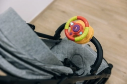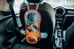 Takket være klips og spænder fastgør du hurtigt legetøjet til ryglænet på autostolen eller til barnevognens bøjle. Sjov på hver tur.