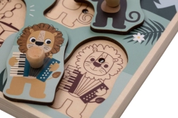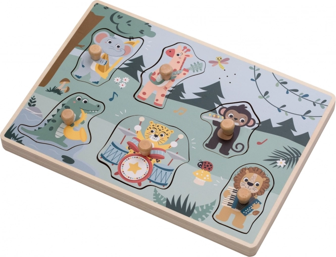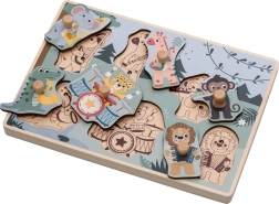 Udforsk junglens verden med et sikkert træpuslespil, der afspiller lydene fra hvert dyr, når den rigtige brik lægges på plads. Børn øver legende at genkende former og lærer at forbinde billede med lyd.