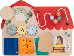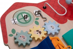 Denne kvalitets træaktive plade er ideel til børn fra 18 måneder. Åbningsklapper, spænder, lynlåse, snørebånd, tandhjul og simple låse tilbyder varierede aktiviteter, der udvikler færdigheder gennem leg. Den robuste udførelse og de stærke farver indbyder til at udforske og prøve selv.