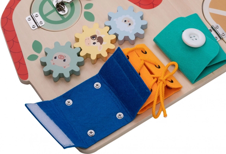 Åbningsklapper, låse, lynlåse og snørebånd understøtter finmotorik og træning af fingerfærdighed på en legende måde.
