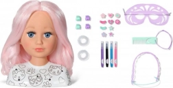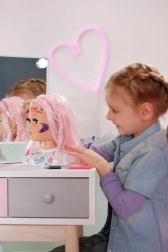 Dette kreative frisørhoved er ideelt til små stylister og makeupartister. De lange pink nylonhår af høj kvalitet holder formen godt og er perfekte til børstning, fletninger og opsætninger. Med de medfølgende tuscher og skabelon kan man desuden nemt lave original makeup og sjove motiver i ansigtet.