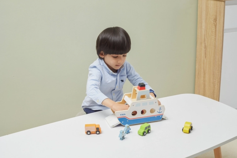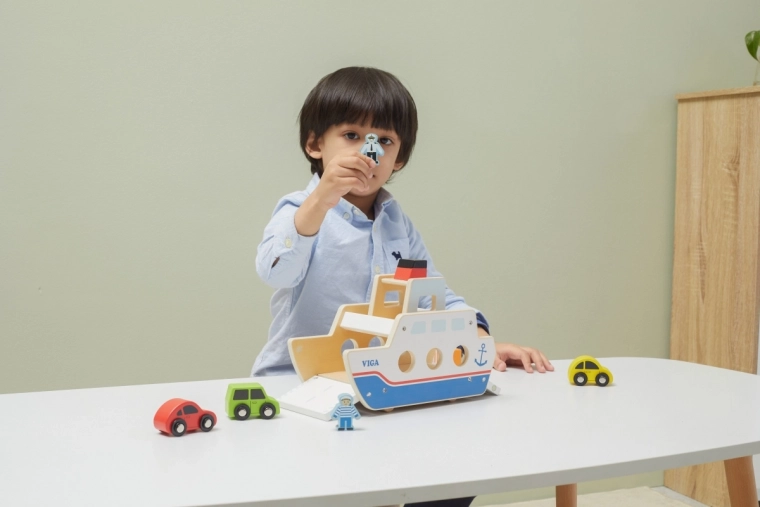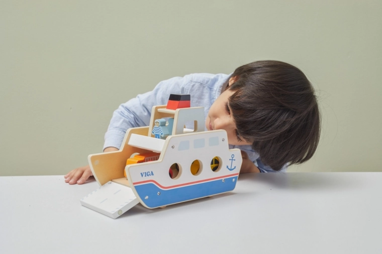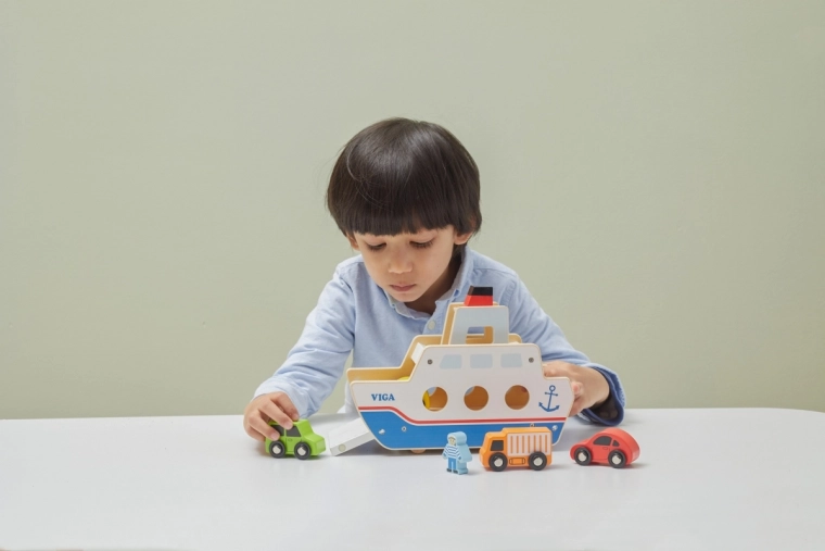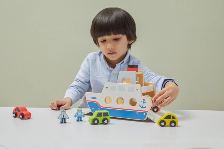 Bilerne kan køre ombord og i land fra begge sider, hvilket understøtter realistisk leg og bevægelseskoordination.