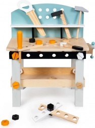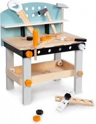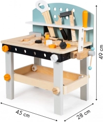 Træbørnsarbejdsstation ECOTOYS er det ideelle valg for små hjemmehåndværkere fra 3 år. Dette legebord er lavet af sikre materialer uden skarpe kanter og indeholder 38 elementer til kreativ leg, herunder arbejdsbord med huller, værktøjsopbevaring og hylder under arbejdsbordet.