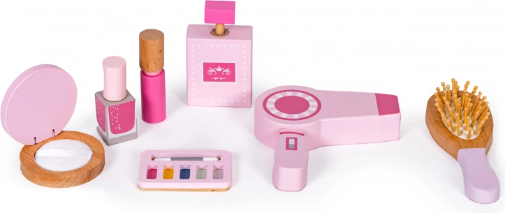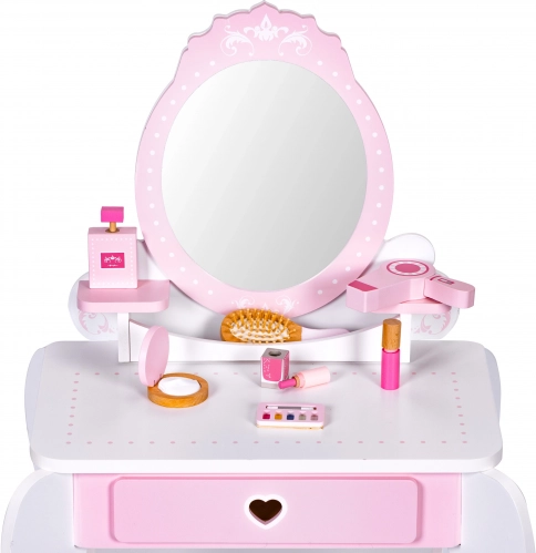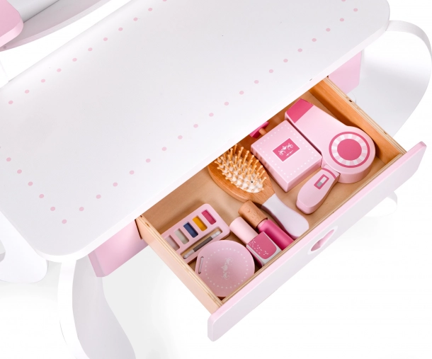 Sminkebordet leveres med legetøj som hårtørrer, børste, pudderdåse med applikator, øjenskyggepalette, neglelak, læbestift og parfumeflaske. Alt tilbehør har afrundede kanter og er helt sikkert for børn.