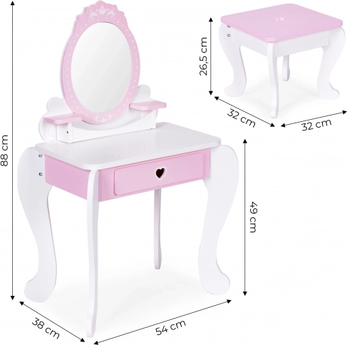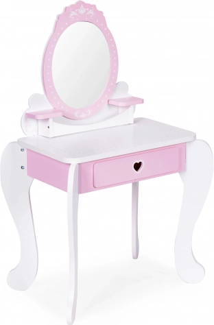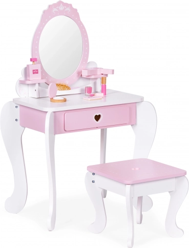 Sminkebordet er fremstillet af sikkert træ og designet til at støtte udviklingen af dit barns finmotorik og fantasi. Det gør det også muligt at lære makeup-basics. De praktiske egenskaber omfatter en udtrækkelig skuffe og to hylder, som sørger for en organiseret og ryddelig overflade.