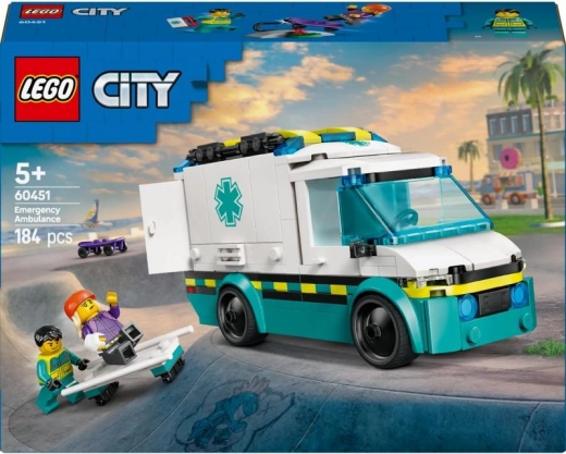Tag på redningsmission med sættet LEGO City Ambulance, ideelt til børn fra 5 år. Åbne sidepaneler og bagdøre giver adgang til båre og medicinsk udstyr, inkl. sprøjte, forbinding og lægetaske. Sættet indeholder også et skateboard, en rampe og to minifigurer til realistisk rolleleg.