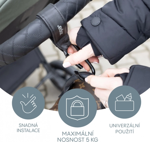 Den multifunktionelle rem med karabinhage Deluxe er den ideelle løsning for forældre og indkøbere, der ønsker hænderne fri. Takket være nem montering med velcro fastgør den sikkert pusletaske, håndtaske eller indkøbspose på barnevognens håndtag.