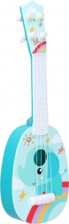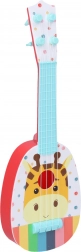 Denne børneguitar med afrikanske dyremotiver er ideel til små begyndere. Den har fire kunstige strenge og en længde på 37 cm, hvilket gør den til et perfekt valg for nem håndtering og spil.