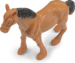 Modellen er lavet af kvalitets- og holdbart plast, som tåler daglig leg. Den samlede længde er cirka 27 cm, og hesten måler omkring 8 cm – ideel størrelse til små hænder og masser af sjov.