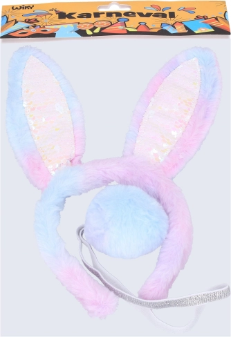 Sødt karnevalssæt til at forvandle dig til en glitrende kanin. Ideelt til karneval, maskebal og temafotografering. Pakken indeholder ører og hale, som nemt fuldender enhver kostume.