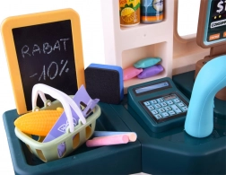 Hele sættet er lavet af plast i behagelige, afdæmpede farver og omfatter 71 stykker tilbehør, herunder frugt, grøntsager, bagværk og mange andre varer, hvilket giver børn endeløs leg. Kassen har en udtræksskuffe til penge og en bærbar stregekodelæser, der laver realistiske lyde, hvilket gør legen endnu mere spændende.