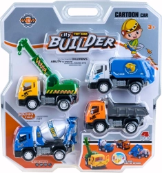 Sæt af fire sjove køretøjer, der vil tiltrække enhver fan af byggeteknik. Farverig og solid konstruktion sikrer sikkerhed for selv de mindste børn. Takket være de mindre dimensioner er de ideelle til små børnehænder og lette at transportere til en gåtur eller børnehave.