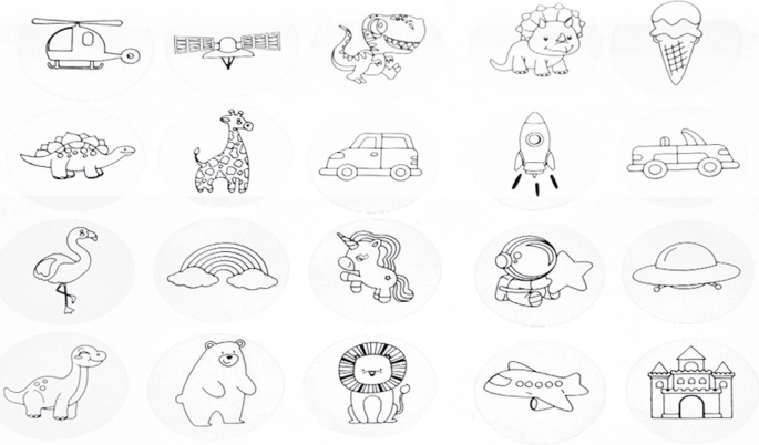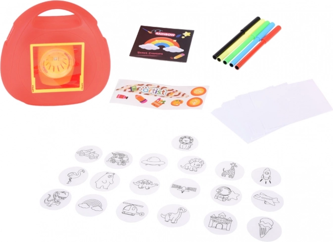 Sættet indeholder fem farvede tuscher og forskellige tematiske dias for uendelige tegnemuligheder.
