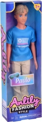 Dukken Paulo fra Anlily udmærker sig ved et moderne look, lyst hår og blå øjne. Han er iført en stilfuld blå T-shirt med print og lange beige bukser, suppleret med brune sko. Takket være bevægelige lemmer er han ideel til realistisk posering og små scener.