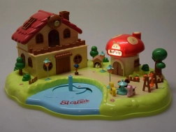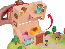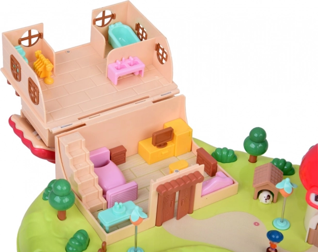 Soveværelse med skab der kan åbnes, badeværelse med badekar og vaskemaskine, køkken med køleskab og et værelse med toiletbord. Udenfor venter en legeplads med karrusel og gynge samt en butik formet som en svamp.