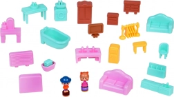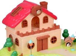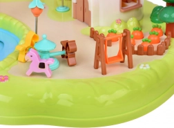 Det fleretagers interiør er rigt udstyret: I stueplan finder du et soveværelse med komfortabel seng og skab der kan åbnes, der er også sofa, TV og kommode; på første sal er der et badeværelse med badekar, håndvask og vaskemaskine; næste niveau byder på et køkken med køleskab og et værelse med toiletbord. I haven venter en karrusel og gynge for endnu mere sjov.