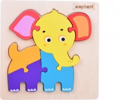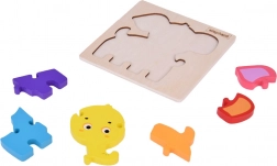 Seks større brikker og en træplade med elefantsilhuet gør det nemt at lægge rigtigt og styrker barnets selvtillid under legen.