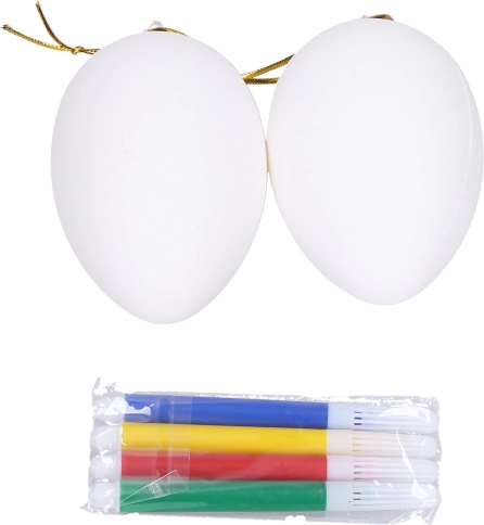 Kreativt sæt til børn og voksne: to plastæg til farvelægning i størrelsen 5 × 8 cm suppleret med 4 farvede tuscher. Ideelt til påskedekorationer, kreativt arbejde og udvikling af fantasi.