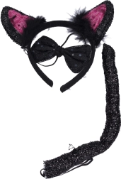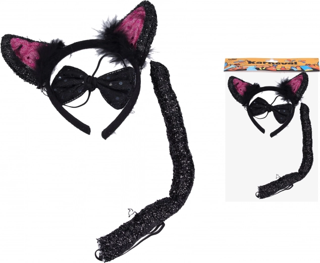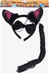 Karnevalsæt "sort kat" er det ideelle valg for børn, der vil forvandle deres drømme til virkelighed og blive en elegant kattefigur. Sættet indeholder et hårbånd med katteører, bowtie og hale, hvilket muliggør en komplet udklædning.
