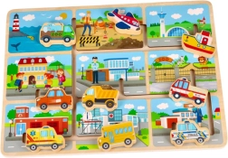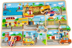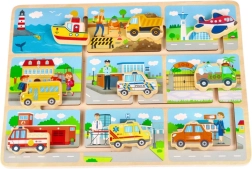 Dette farverige træpuslespil giver børn glæden ved at udforske forskellige transportmidler. Her finder du en skolebus, en politibil, en ambulance og andre køretøjer, som nemt placeres i de tilsvarende udskæringer.