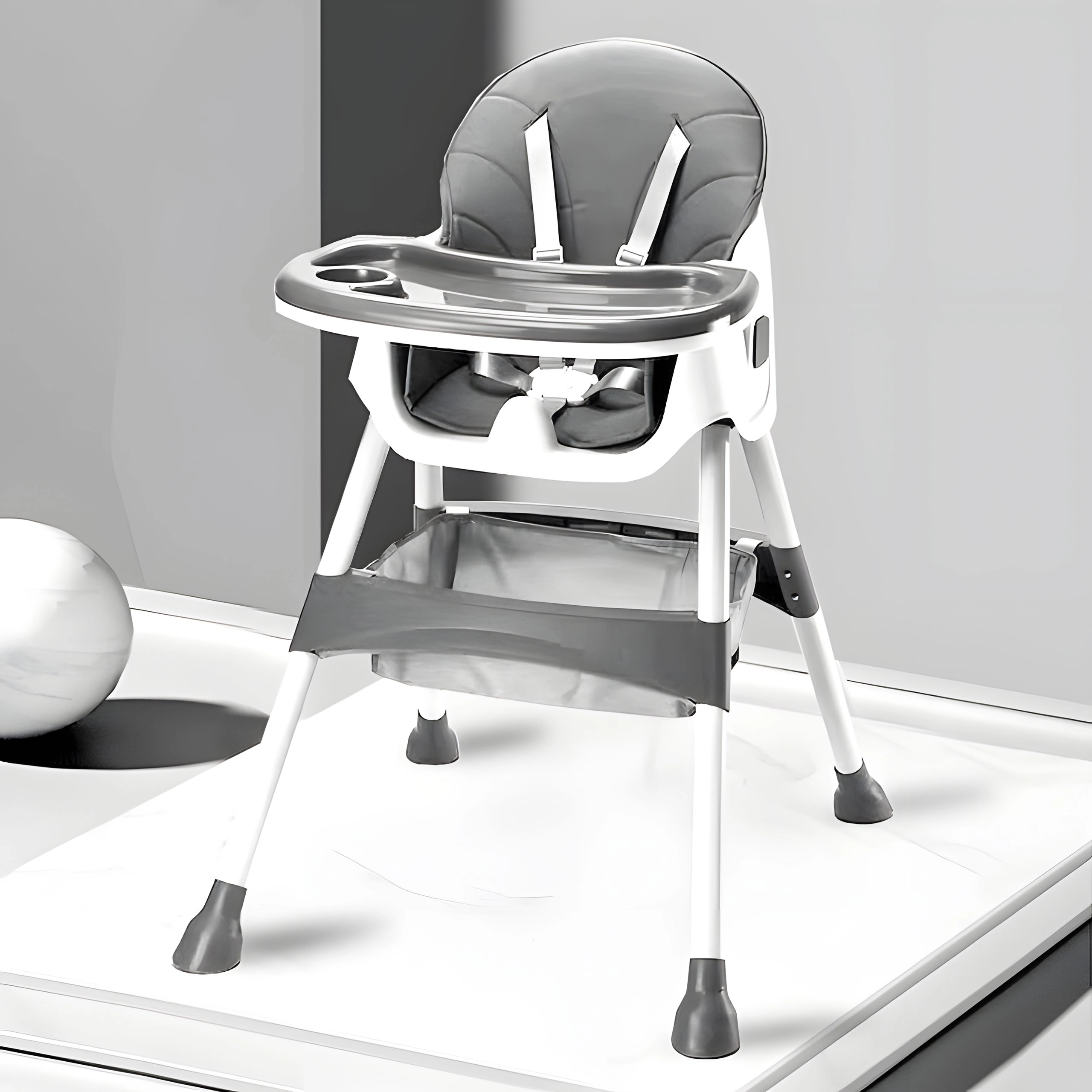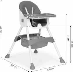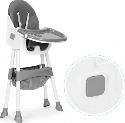 Sikkerheden sikres af en 5-punkts sele og stabile metalben med skridsikre endestykker. Den aftagelige to-lags bakke har forhøjede kanter og kopholder, og det øverste lag kan vaskes i opvaskemaskinen. Den sammenklappelige konstruktion sparer plads, og kurven under sædet holder hagesmække, servietter og legetøj lige ved hånden.