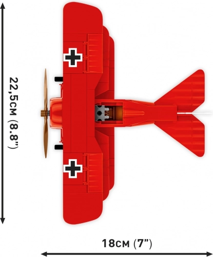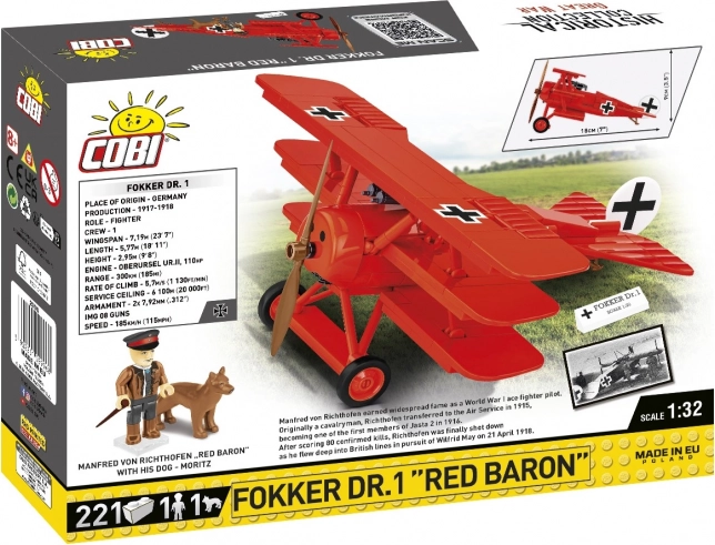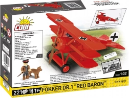 Oplev luftfartshistorien med den autentiske model af Fokker DR.1 Red Baron i skala 1:32 fra COBI. Sættet indeholder 221 kvalitetsdele, detaljerede tryk i stedet for klistermærker, bevægelige elementer (propel, hjul, ror) og desuden en minifigur af Manfred von Richthofen samt hans hund Moritz. Ideelt til samlere, historieentusiaster og kreativ leg.