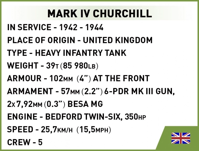 Den ikoniske CHURCHILL-tank er blandt de mest kendte allierede køretøjer fra Anden Verdenskrig. Den er værdsat for kraftig pansring, lav profil og fremragende terrænegenskaber. Dette byggesæt i skala 1:35 gengiver trofast detaljerne fra det virkelige køretøj, inklusive historiske markeringer og besætningsuniformer takket være præcise tryk.