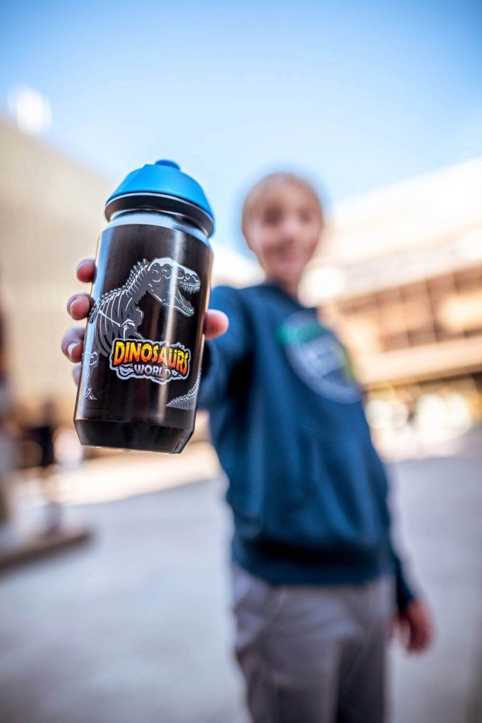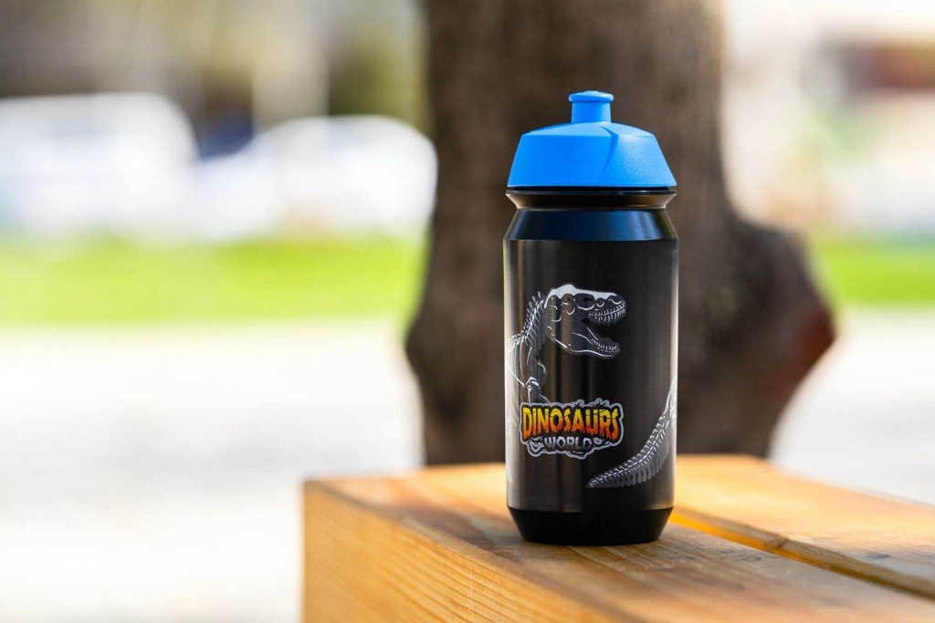 Elegant drikkeflaske med dinosaurmotiver, ideel til nutidens eventyrlystne børn. Praktisk og sikker til daglig brug.