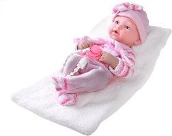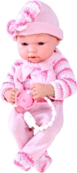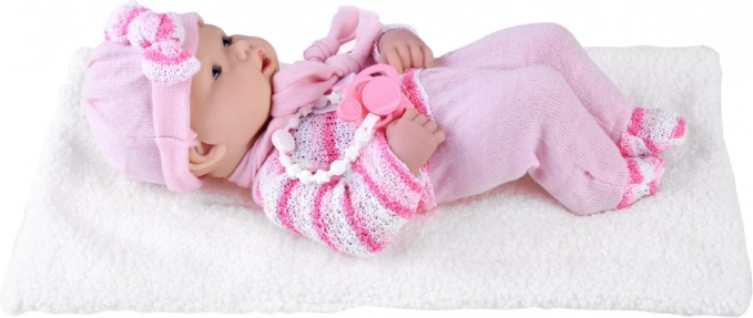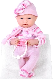 Denne realistiske babydukke i et lyserødt strikket sæt med sød hue er fremstillet af kvalitets- og børnesikker plast. Detaljeret ansigt med blå øjne og fine træk understøtter naturlig omsorg og kram. Takket være bevægelige lemmer og hoved kan du nemt sætte den, lægge den ned eller svøbe den i tæppet.