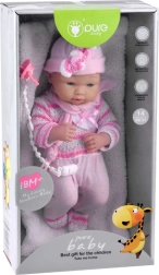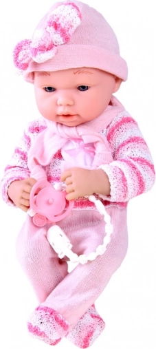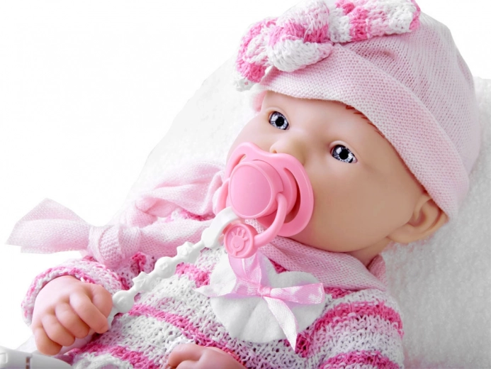 Detajleret ansigt, fine træk og et lyserødt strikket sæt med hue sikrer et naturligt og blidt udtryk, som indbyder børn til at kramme og passe på dukken.