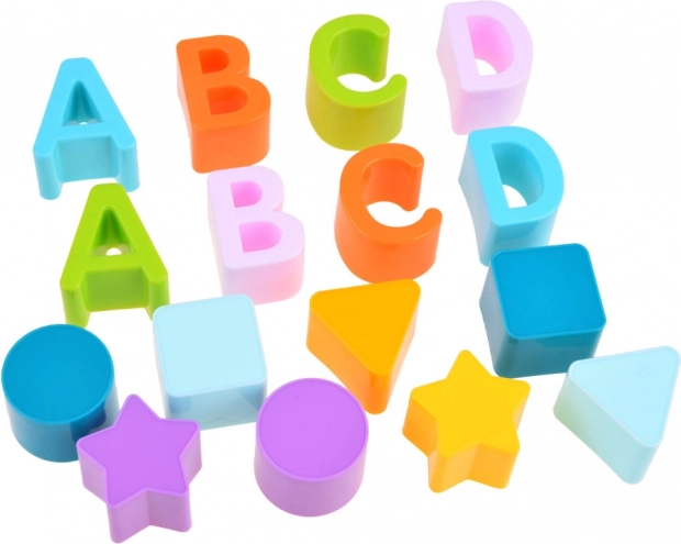 Læresæt – spand med klodser og bogstaver, formesorterer, 16 dele