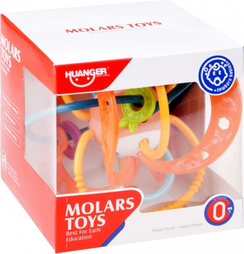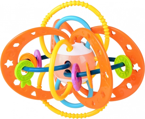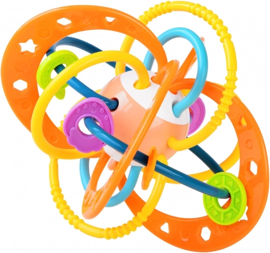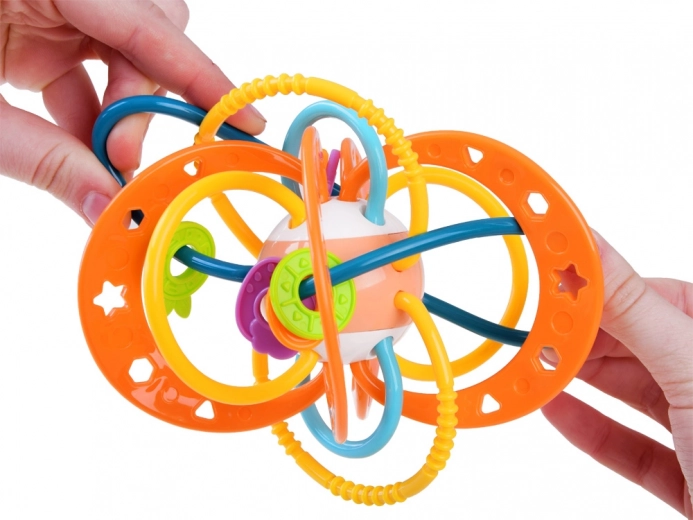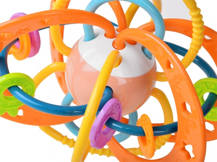 Denne farverige bidering med rangle tilbyder masser af sanseindtryk til babyens udvikling. De sammenflettede løkker er nemme at gribe for små hænder, og de skiftende teksturer masserer gummerne og lindrer ubehag ved tandfrembrud. Den lette konstruktion er ideel både hjemme og på farten.